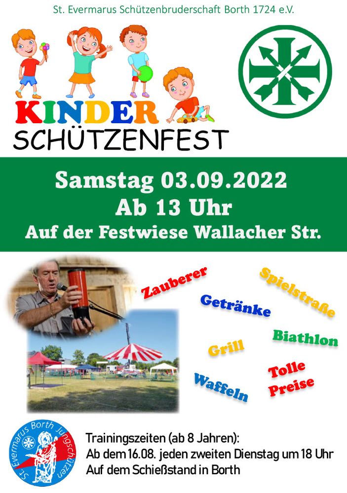 Am ersten Samstag im September steigt ab 13:00 Uhr unser Kinderschützenfest. Eingeladen sind ALLE Kinder (auch, wenn der Vater nicht Mitglied der Bruderschaft ist). Neben unserem Preis- und Königsschießen mit tollen Preisen warten auf Euch eine tolle Spielstraße, ein Sommerbiathlon und Zauberer Magic Wobo!