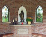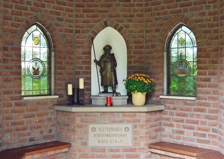 Eingerahmt wird die Figur durch zwei Buntglasfenster. Eines zeigt den Hl. Lambertus, das andere die Evermaruskapelle im belgischen Rutten. Auf dem Boden ist der Borther Brunnen zu sehen.