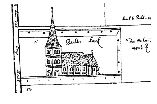 Darstellung der Borther Kirche im Atlas der Wallacher Deichschau, umgeben von einer Mauer mit Schießscharten