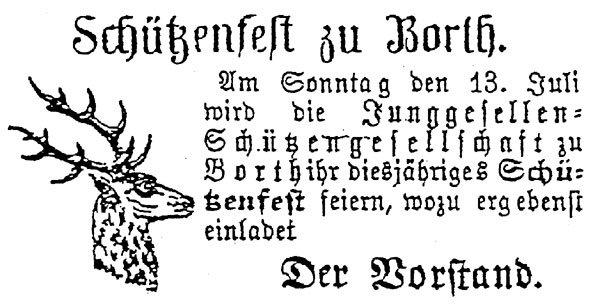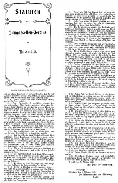 Am 1. Nov. 1887 wurden erstmals schriftliche Statuten aufgestellt und in gedruckter Form mit Genehmigungsvermerk des Bürgermeisters Meckel herausgegeben. Der Verein trägt den Namen „Junggesellen-Verein zu Borth“. Kirchliche Bezüge kommen, wohl als Folge des Kulturkampfes, in den Statuten nicht vor. 1892 Die älteste erhaltene Mitgliederliste vom 23.09.1892 enthält 40 Namen. 1903 Am 8. Okt. 1903 werden die Statuten mit leichten Veränderungen neu aufgelegt, mit Genehmigungsvermerk des Bürgermeisters Roll.