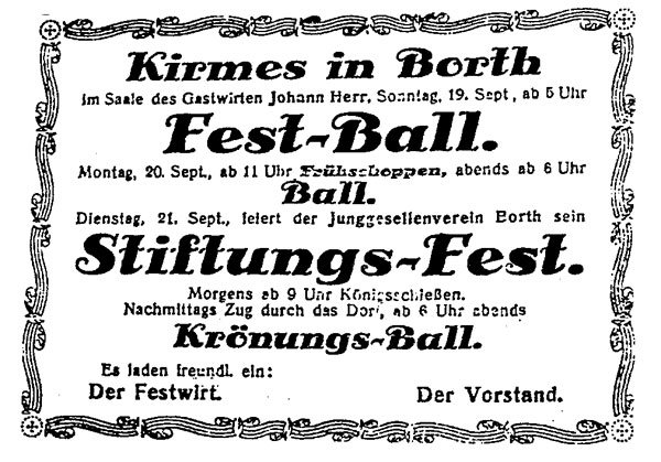 In den Jahren 1933 bis 1935 veranstaltete die Bruderschaft auch einen Fastnachtszug in Borth. Von 13. Feb. 1934 ist eine ganze Bilderserie erhalten.
