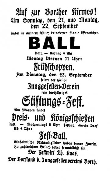 Da sich der Borther Junggesellenbruderschaft der Gleichschaltung im Deutschen Schützenbund widersetzte um kirchliche Bruderschaft zu beleiben, wurde 1936 kein Schützenfest mehr genehmigt. 1937 musste auch das gemütliche Beisammensein nach dem Kirchgang am Kirmesdienstag entfallen.