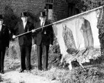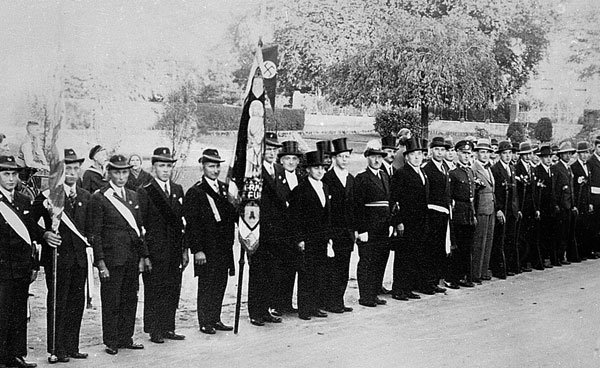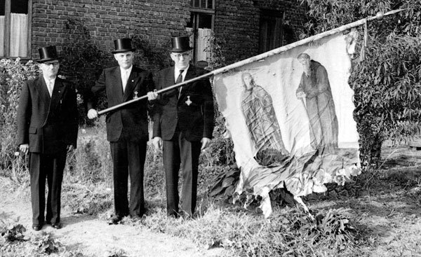 Nach langem Sparen konnte unsere heutige Vereinsfahne angeschafft werden, die am 5. Mai 1929 mit einem großen Fest geweiht wurde. (Festschrift, Zeitungsbericht, Foto der Bruderschaft mit Namensliste)